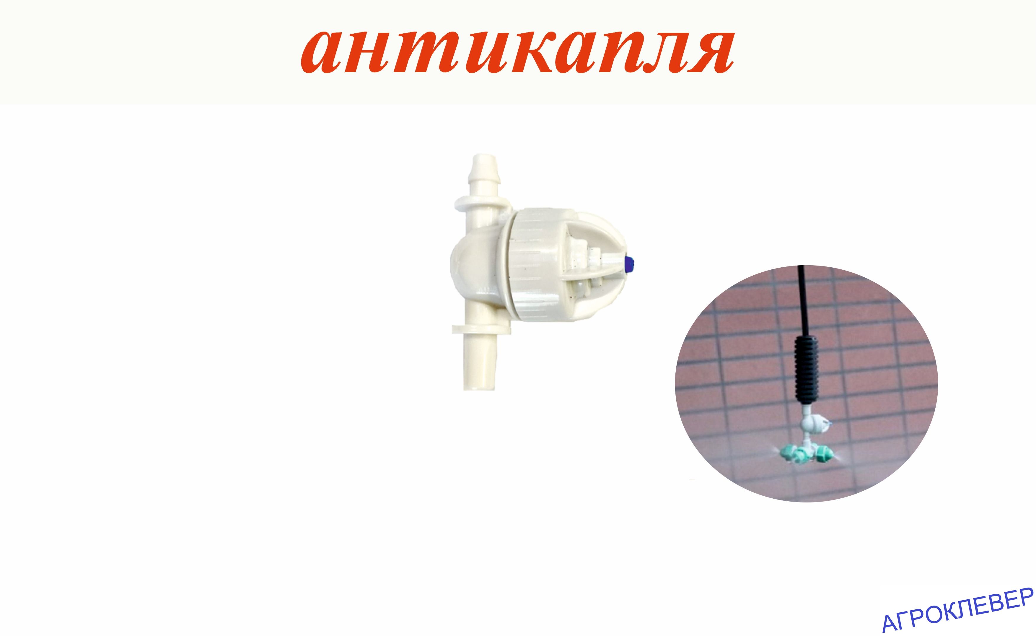 Миникран запорный антидренажный, антикапля, предназначен для предотвращения выткания воды из магистральной трубы расположенной уровнем выше распыляющих форснок, в частности клапаны антикапля применяются для микроспринклеров, туманообразователей, фогеров подключенных на подвесах , то есть когда труба закреплена на высоте 2-3 метра над уровнем грунта и от нее спускаются подвесы с распылителями.