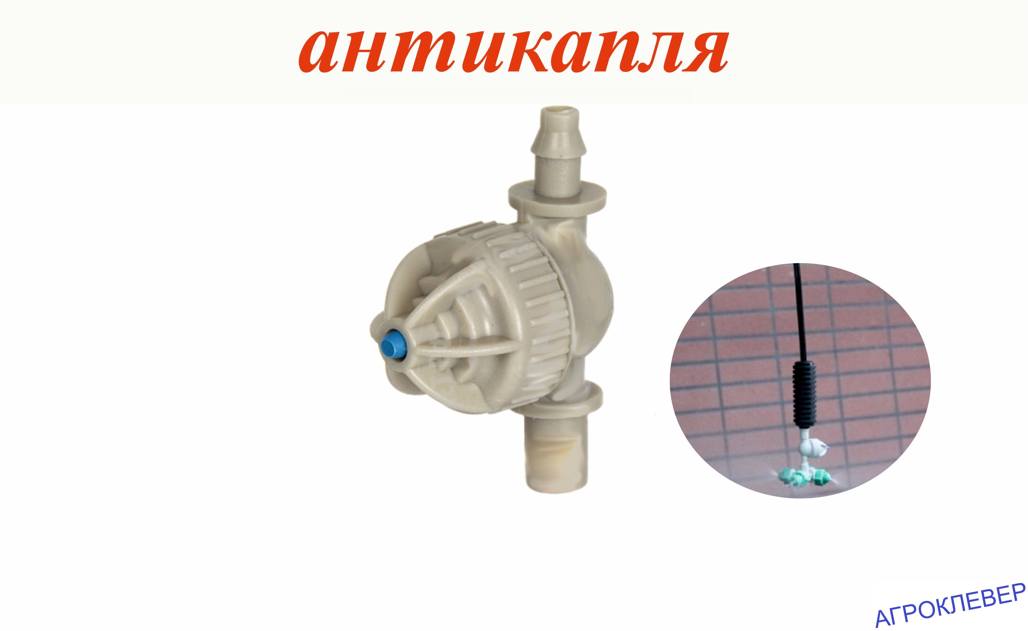 Миникран запорный антидренажный, антикапля, предназначен для предотвращения выткания воды из магистральной трубы расположенной уровнем выше распыляющих форснок, в частности клапаны антикапля применяются для микроспринклеров, туманообразователей, фогеров подключенных на подвесах , то есть когда труба закреплена на высоте 2-3 метра над уровнем грунта и от нее спускаются подвесы с распылителями.