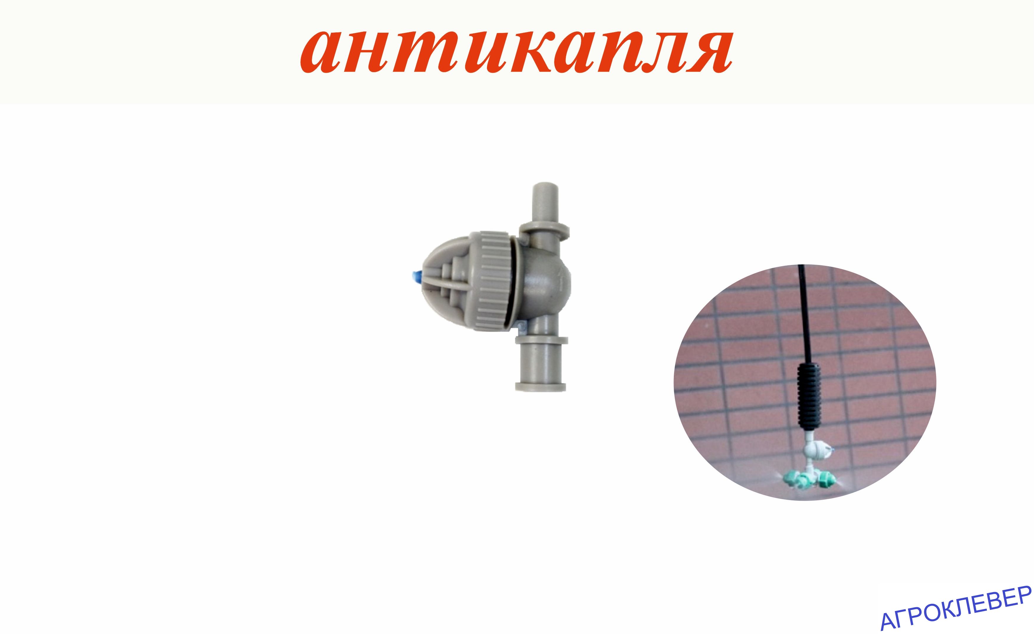 Миникран запорный антидренажный, антикапля, предназначен для предотвращения выткания воды из магистральной трубы расположенной уровнем выше распыляющих форснок, в частности клапаны антикапля применяются для микроспринклеров, туманообразователей, фогеров подключенных на подвесах , то есть когда труба закреплена на высоте 2-3 метра над уровнем грунта и от нее спускаются подвесы с распылителями.