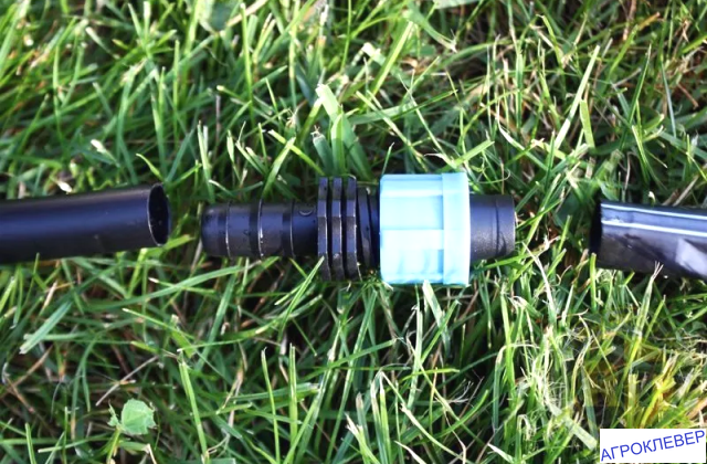 Лента надежно и герметично фиксируется затяжной гайкой на фитинге, а с другой стороны на штуцер можно присоединить садовый шланг или трубку.