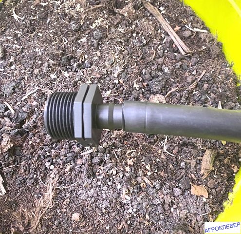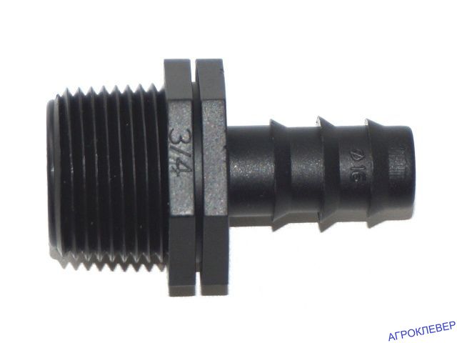 С одной стороны штуцера находится наружная резьба 3/4 дюйма, с другой стороны - выход на шланг типа "елочка" 16 мм