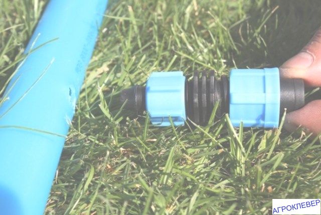 Капельная лента легко фиксируется зажимной гайкой, а коннектор подходит для ПНД труб.